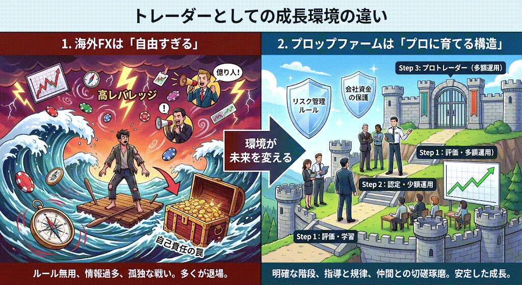 海外FXよりプロップファームが優れている理由は、単に「安全だから」「資金が大きいから」ではありません。